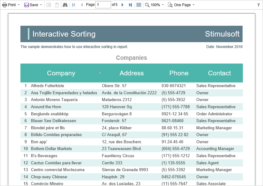 В компоненте Blazor Viewer реализована поддержка динамической сортировки, сворачивания и детализации отчетов. Динамическая сортировка предоставляет возможность изменять направление сортировки в построенном отчете. Для этого следует щелкнуть по компоненту, у которого была установлена динамическая сортировка. Динамическая сортировка осуществляется в следующих направлениях: По возрастанию (Ascending) и По убыванию (Descending). Каждый раз при щелчке по компоненту направление меняется на противоположное.