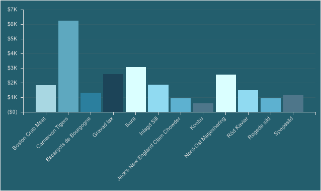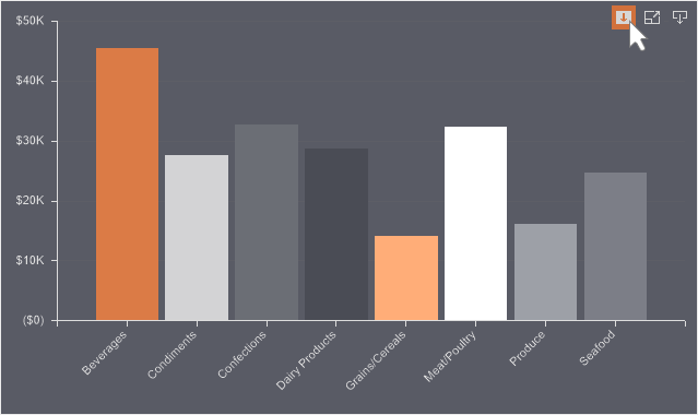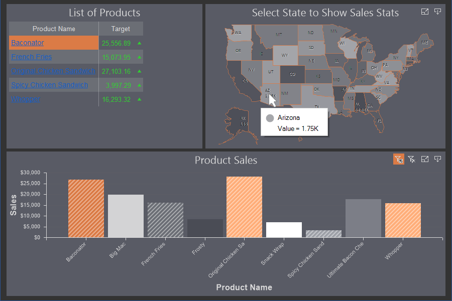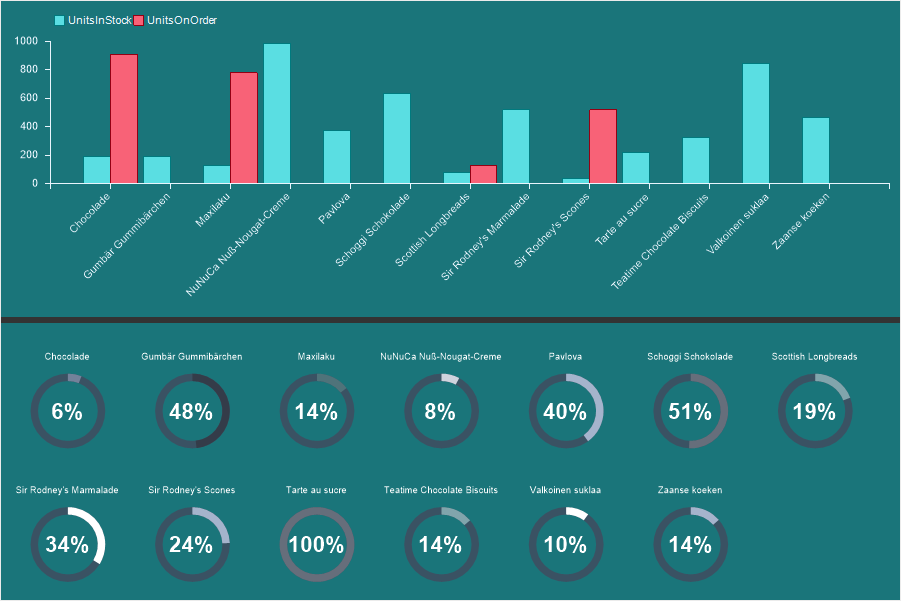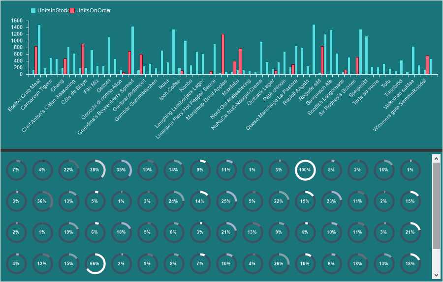 Как видно из рисунка, детализирующей панели индикаторов передан параметр (в текущем примере, имя категории) и данные продуктов отфильтрованы по этому параметру, т.е. отображаются только данные по продуктам входящих в выбранную категорию.