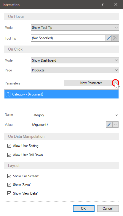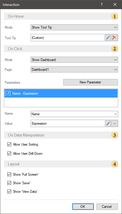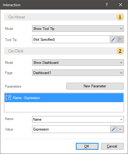 Группа параметров По щелчку (On Click) предоставляет возможность определить интерактивное действие при щелчке левой кнопкой указателя ввода или касании значения элемента панели индикаторов. Параметр Режим (Mode) предоставляет возможность выбрать тип интерактивного действия: