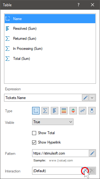 Для каждого поля данных можно настроить интерактивные действия. Для этого в редакторе элемента Таблица следует выделить поле данных и нажать кнопку Изменить.