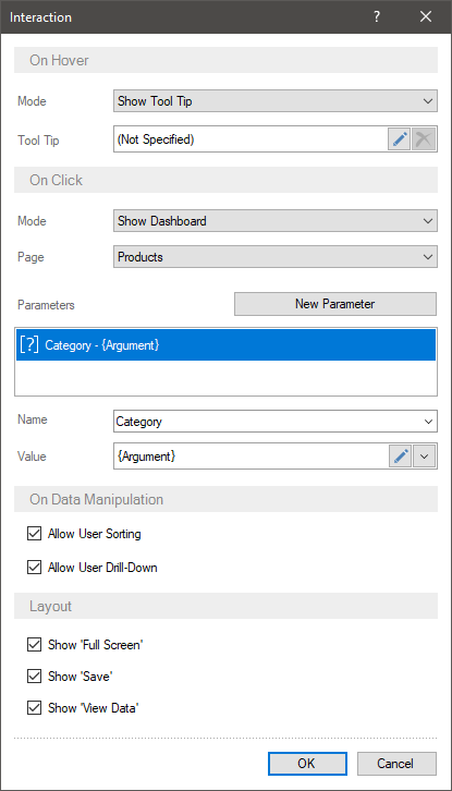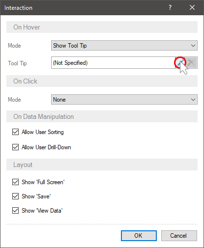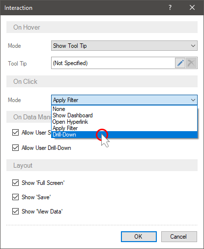 Группа параметров По щелчку (On Click) предоставляет возможность определить интерактивное действие при щелчке левой кнопкой указателя ввода или касании значения поля данных. Параметр Режим (Mode) предоставляет возможность выбрать тип интерактивного действия: