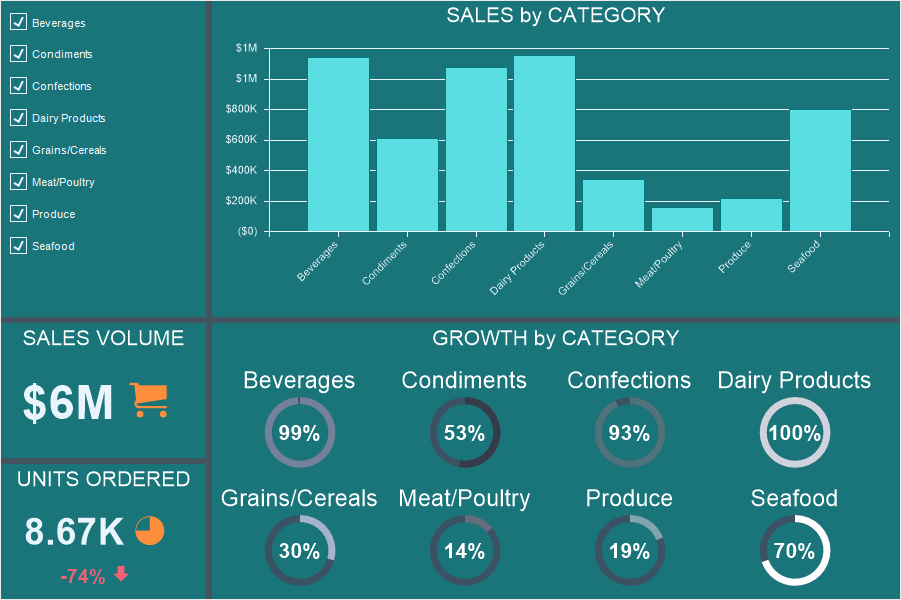 Допустим панель индикаторов отображает статистику продаж по категориям.