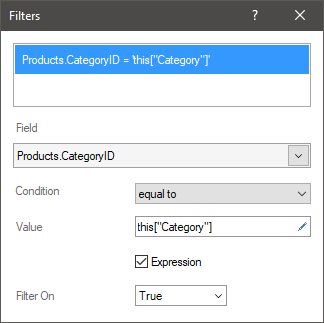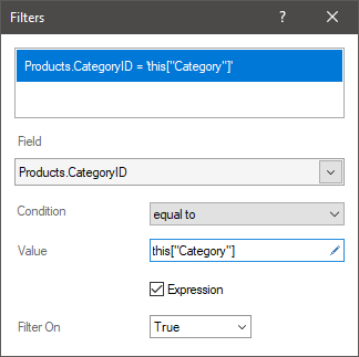 Указать параметр, как второе значение значения фильтра. Если параметр передается напрямую без использования переменной словаря данных, то необходимы указать выражение this["ParameterName"]. Если же используется переменная, то в поле выражение необходимо указать ссылку на эту переменную - {Variable1}.