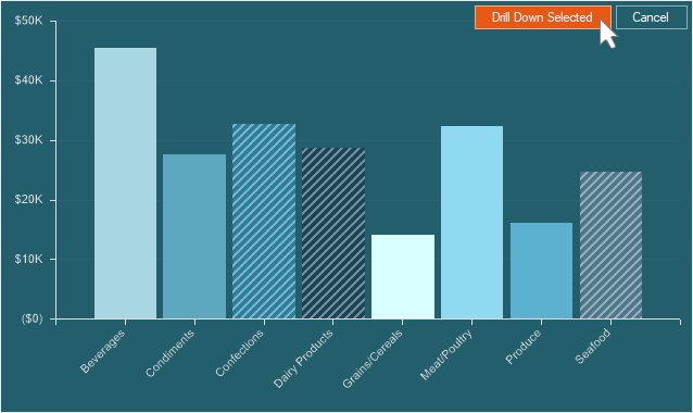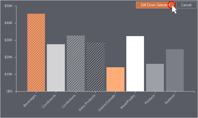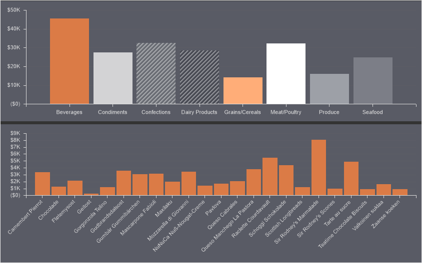 На рисунке выше, представлена пример иерархии данных - на первой диаграмме отображается статистика продаж по категориям, а на второй - статистика продаж продуктов из выбранных категорий.