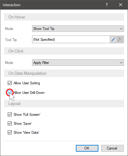 Установить флажок у параметра Разрешить пользовательскую детализацию (Allow User Drill Down).