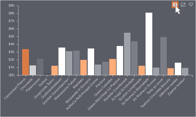 Предоставляет возможность выбрать колонку данных элемента во вьювере, по значениях которой будет выполняться сортировка данных элемента. Если флажок установлен для данного параметра, то при наведении курсора у элемента будет отображаться кнопка сортировки. Если же флажок снят, то кнопка сортировка не будет отображаться при наведении курсора на элемент. |