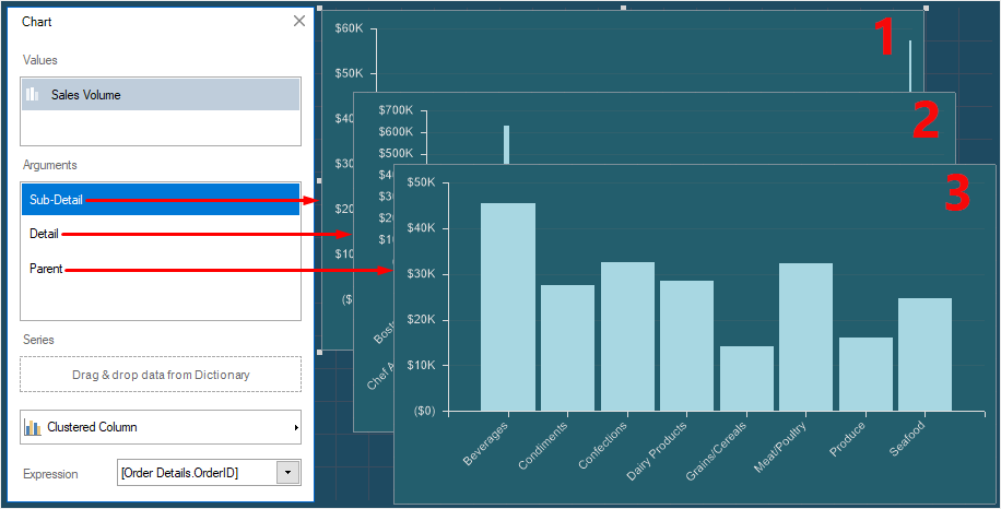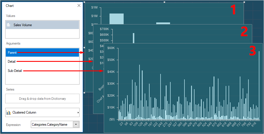 Добавить в элемент главные и подчиненные поля данных в определенном порядке. В случае с диаграммой, детализация осуществляется по полям данных аргументов диаграммы.