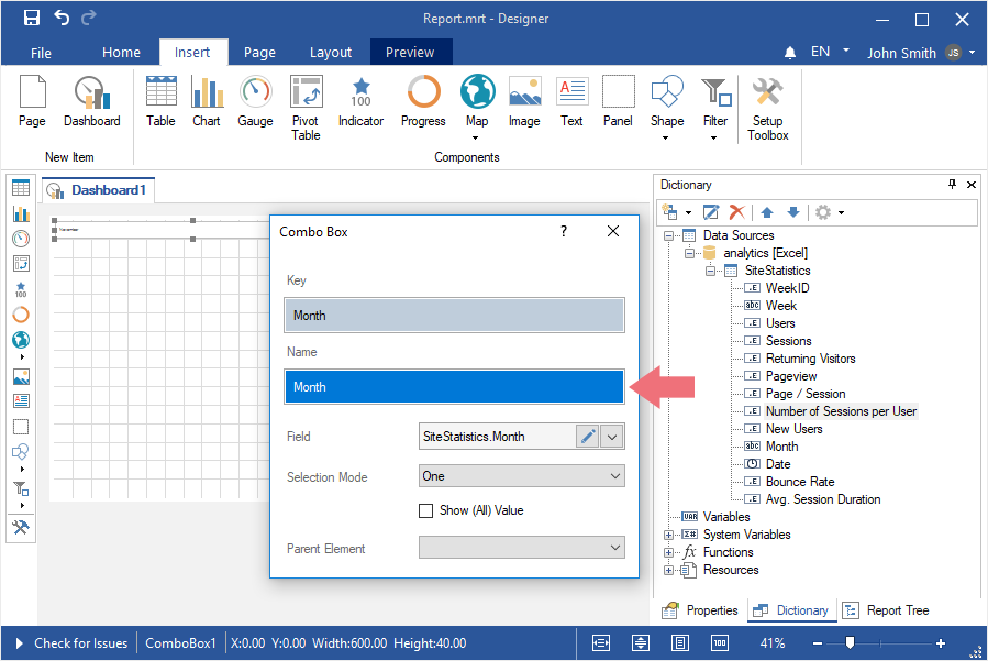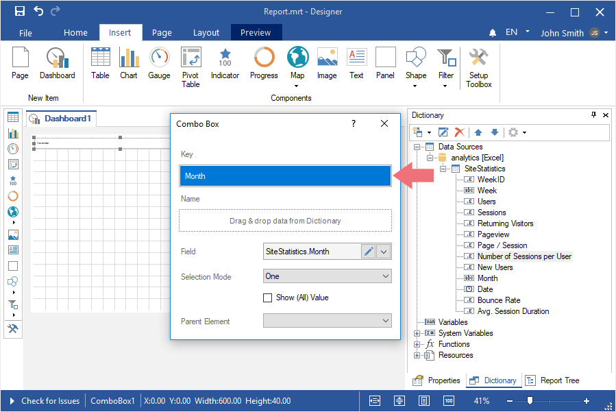 Шаг 8: Перетянуть из словаря данных колонку данных. По умолчанию, колонка данных будет добавлена в поле Ключ (Key);