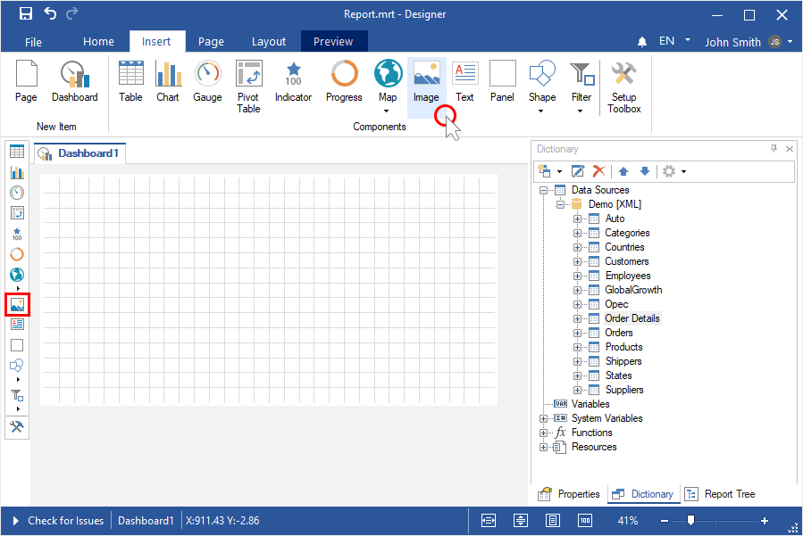 Шаг 3: Выбрать элемент Изображение на инструментарии дизайнера отчетов или на вкладке Вставить (Insert);