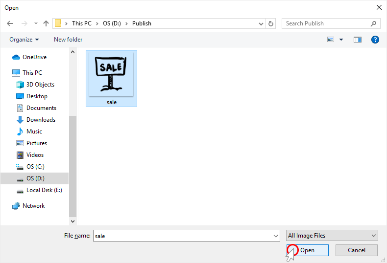 Шаг 3: Выбрать из локального хранилища изображение, и нажать кнопку Открыть в диалоговом окне;