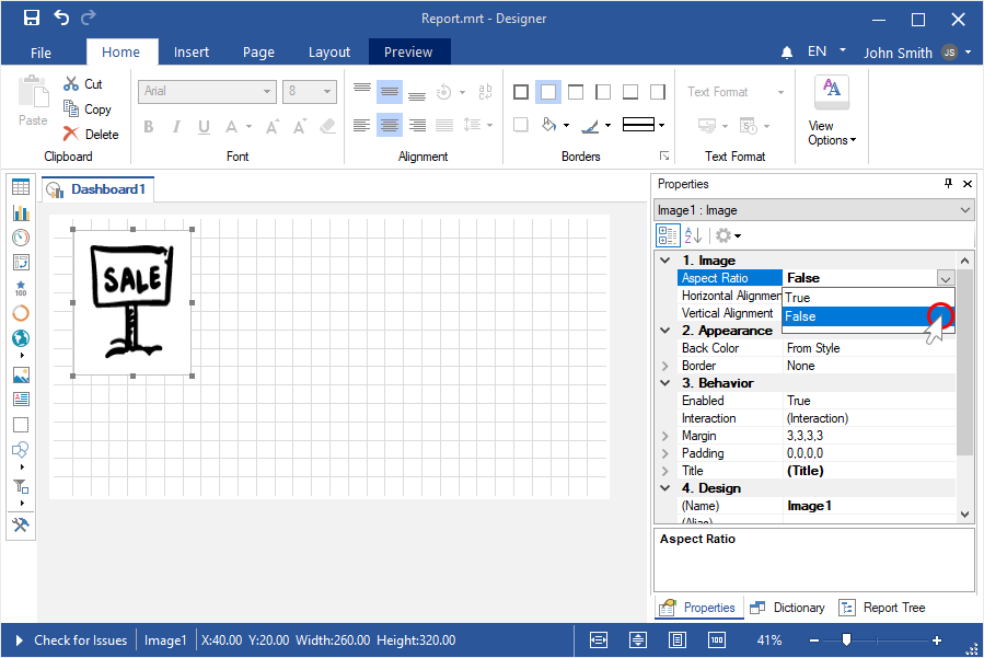 Шаг 2: Установить значение Нет (False) у свойства Соотношение сторон (Aspect Ratio) на панели свойств.