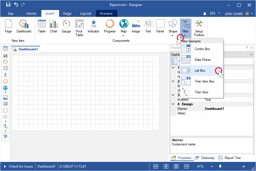 Шаг 4: Выполнить щелчок по категории Фильтры (Filters) на инструментарии дизайнера отчетов или на вкладке Вставить (Insert);