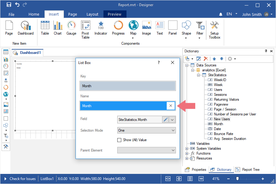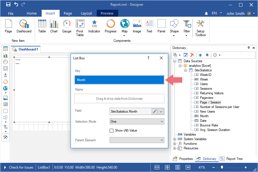 Шаг 8: Перетянуть из словаря данных колонку данных. По умолчанию, колонка данных будет добавлена в поле Ключ (Key);