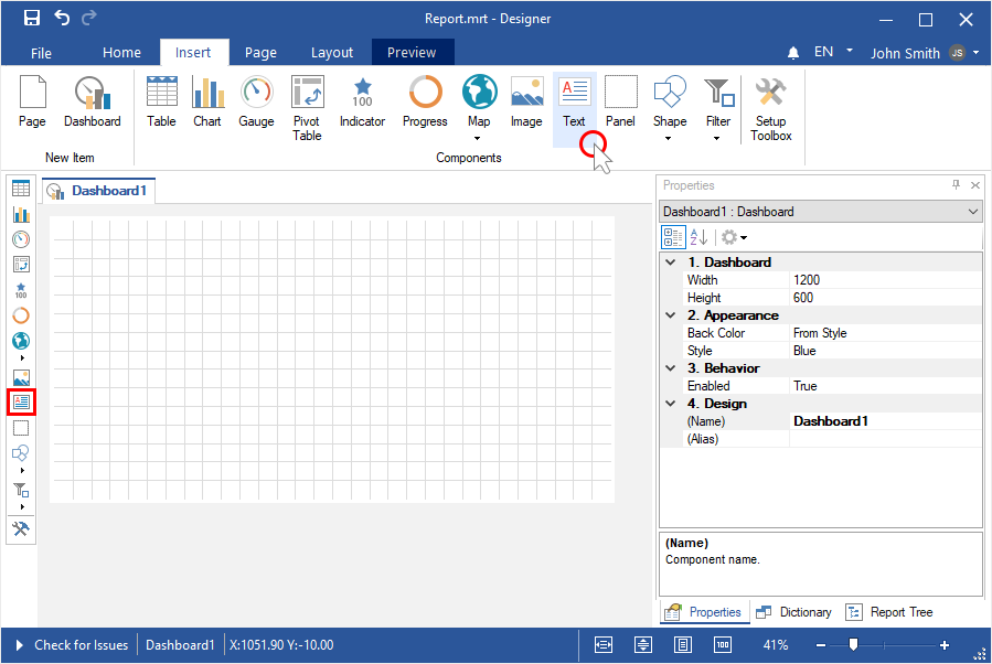 Шаг 3: Выбрать элемент Текст на инструментарии дизайнера отчетов или на вкладке Вставить (Insert);