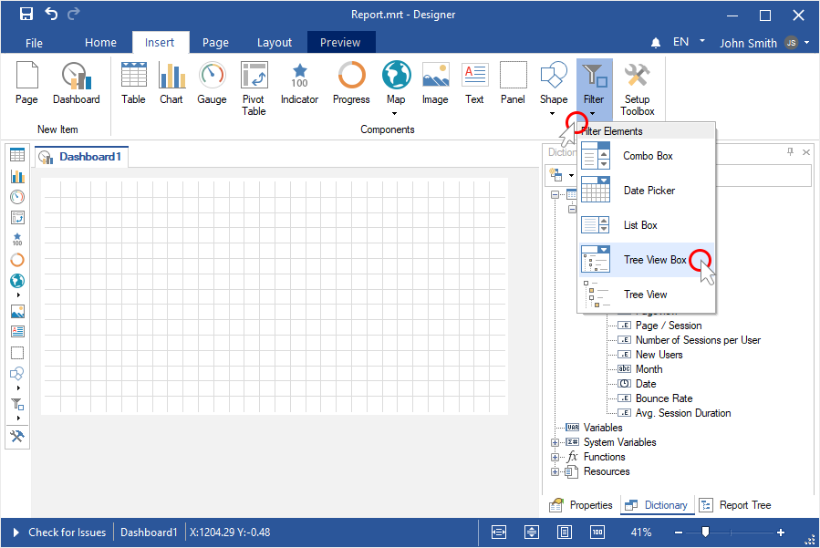 Шаг 4: Выполнить щелчок по категории Фильтры (Filters) на инструментарии дизайнера отчетов или на вкладке Вставить (Insert);