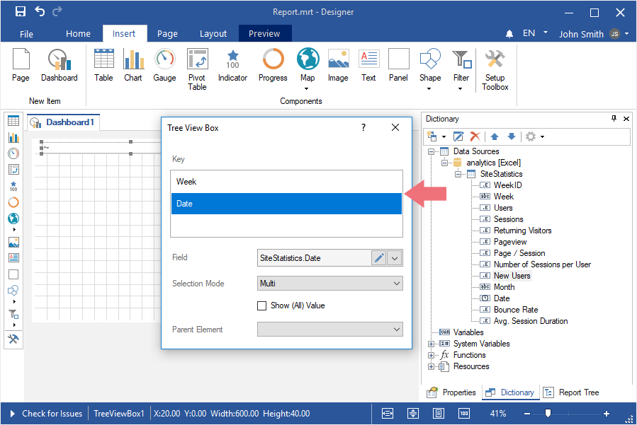 Шаг 8: Перетянуть из словаря данных колонки данных в поле Ключ (Key). Значения из этих колонок данных сформируют иерархию значений текущего элемента. Значениями верхнего уровня иерархии будут значения из верхней колонки, значениями второго уровня - значения из второй колонки данных сверху и т.д.